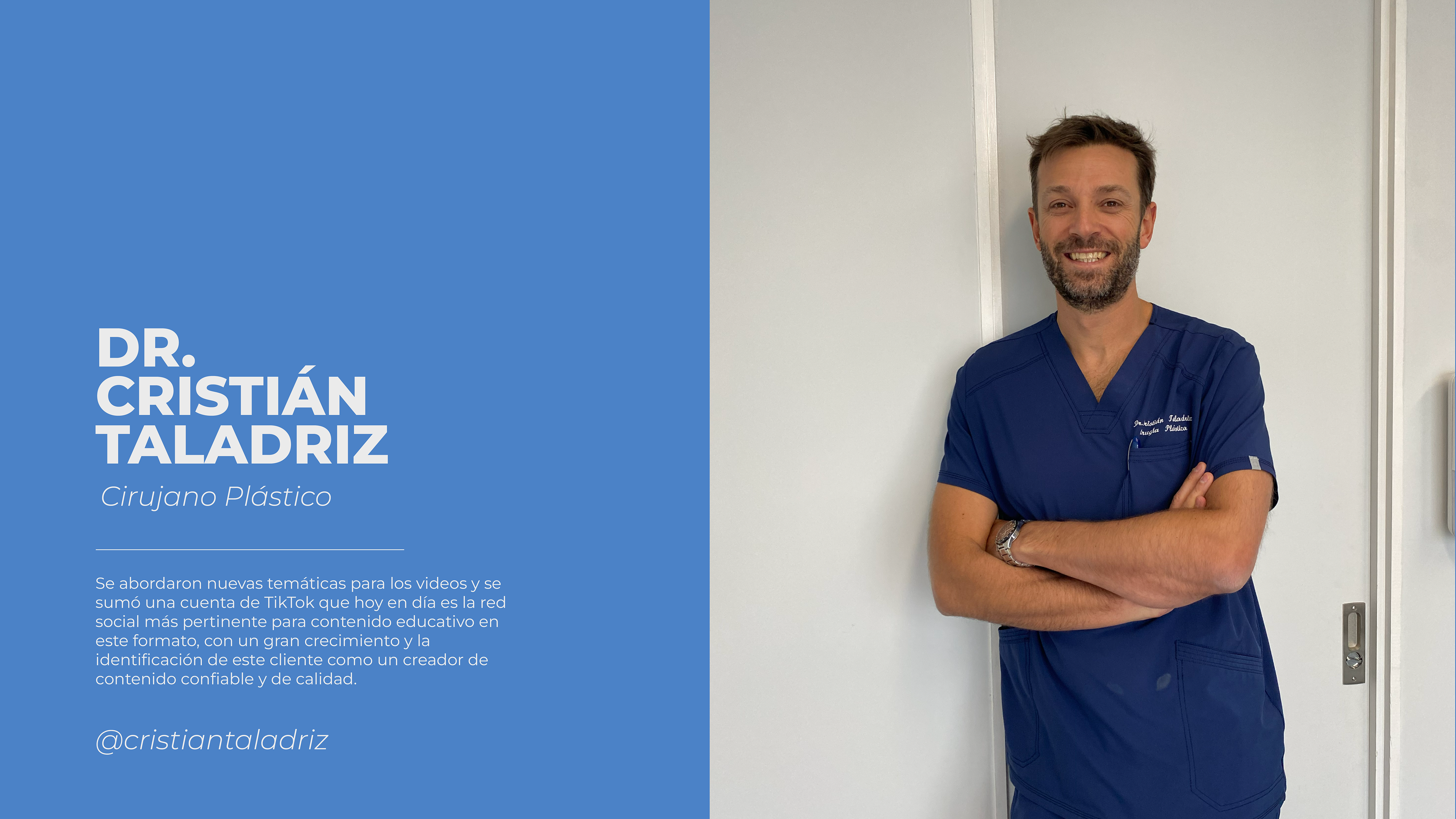 Replantear la creación de contenido de la cuenta del cirujano plástico Dr. Cristián Taladriz, contemplando la imagen de creador de contenido que se requiere proyectar, cercano y profesional. Esto incluye planificación de contenido, creación de guiones para videos de redes sociales, ideación de posts para Instagram, diseño gráfico de posts y videos, grabación de contenido, edición de videos y administración de cuentas de redes sociales (meta y TikTok).
