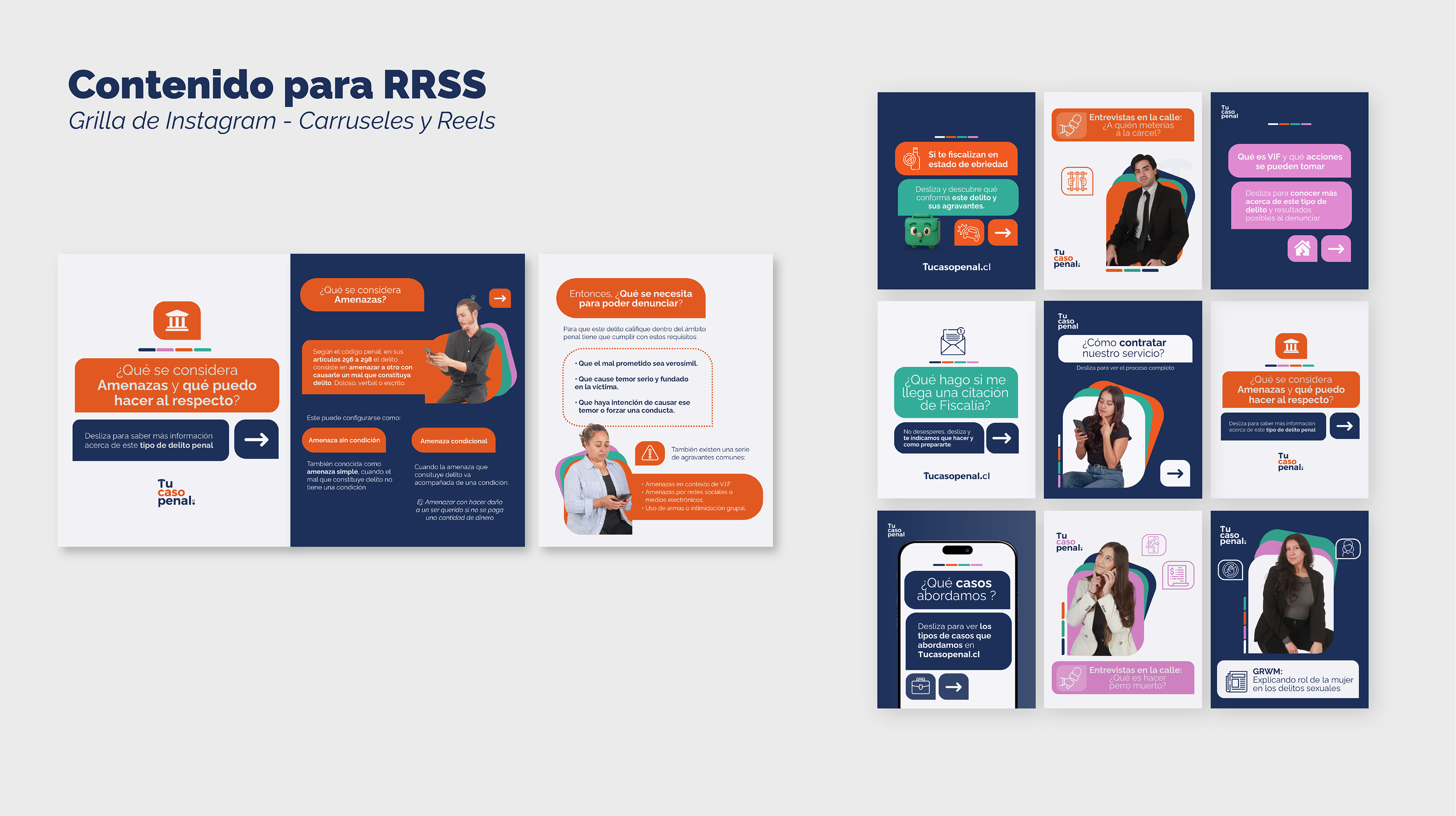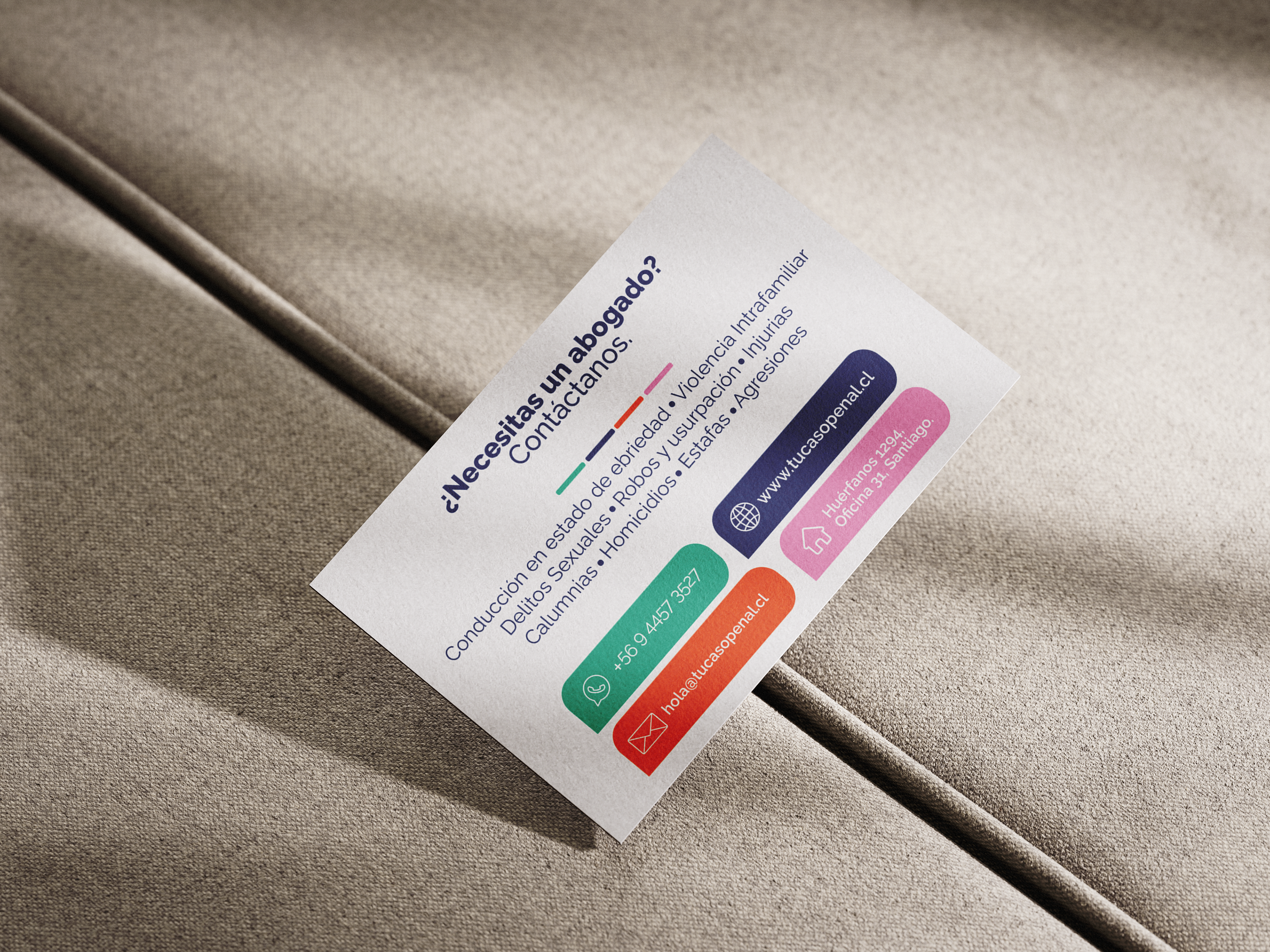 Uno de los mayores desafíos era la poca conexión del público general con servicios de abogados. Se diseño un sitio web simple, directo y autoexplicativo,complementado con contenidos en RRSS hablando de temas jurídicos en forma directa y clara, invitando a conectar con la marca. Además de una serie de elementos gráficos y visuales como material para entregar a clientes, incluyendo: infografías, tarjetas, sobres y carpetas.